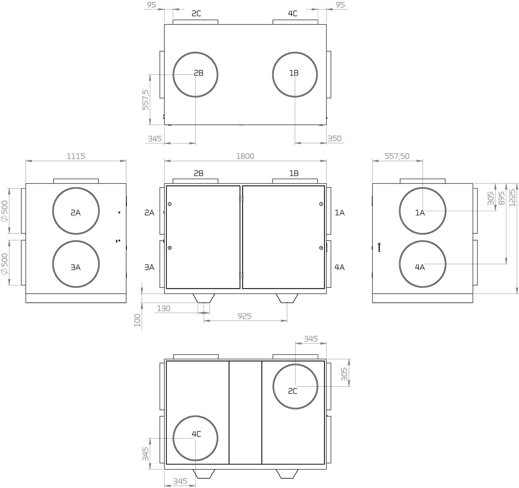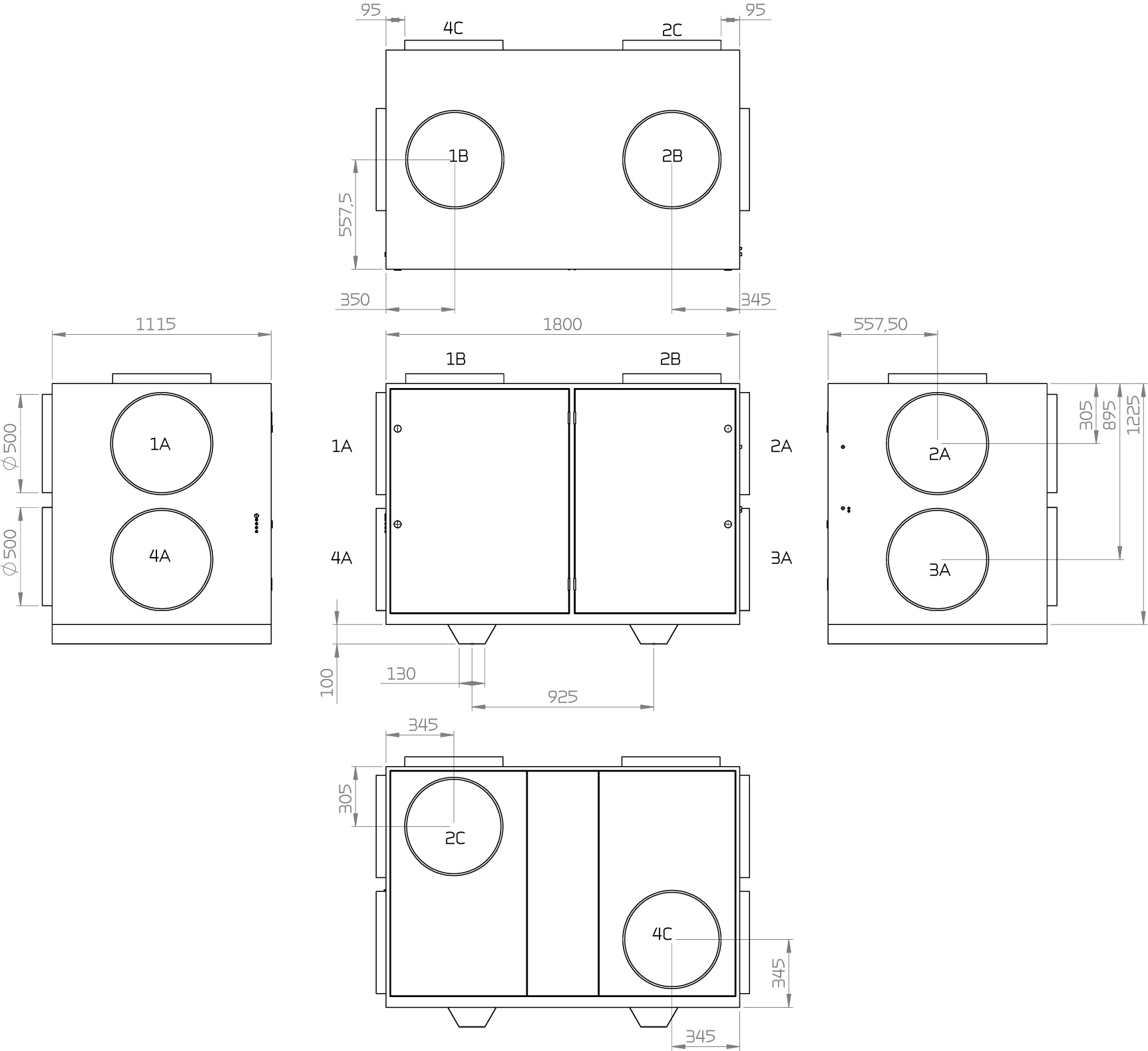 All dimensions are shown in mm. 1. Outdoor air A. Gable location