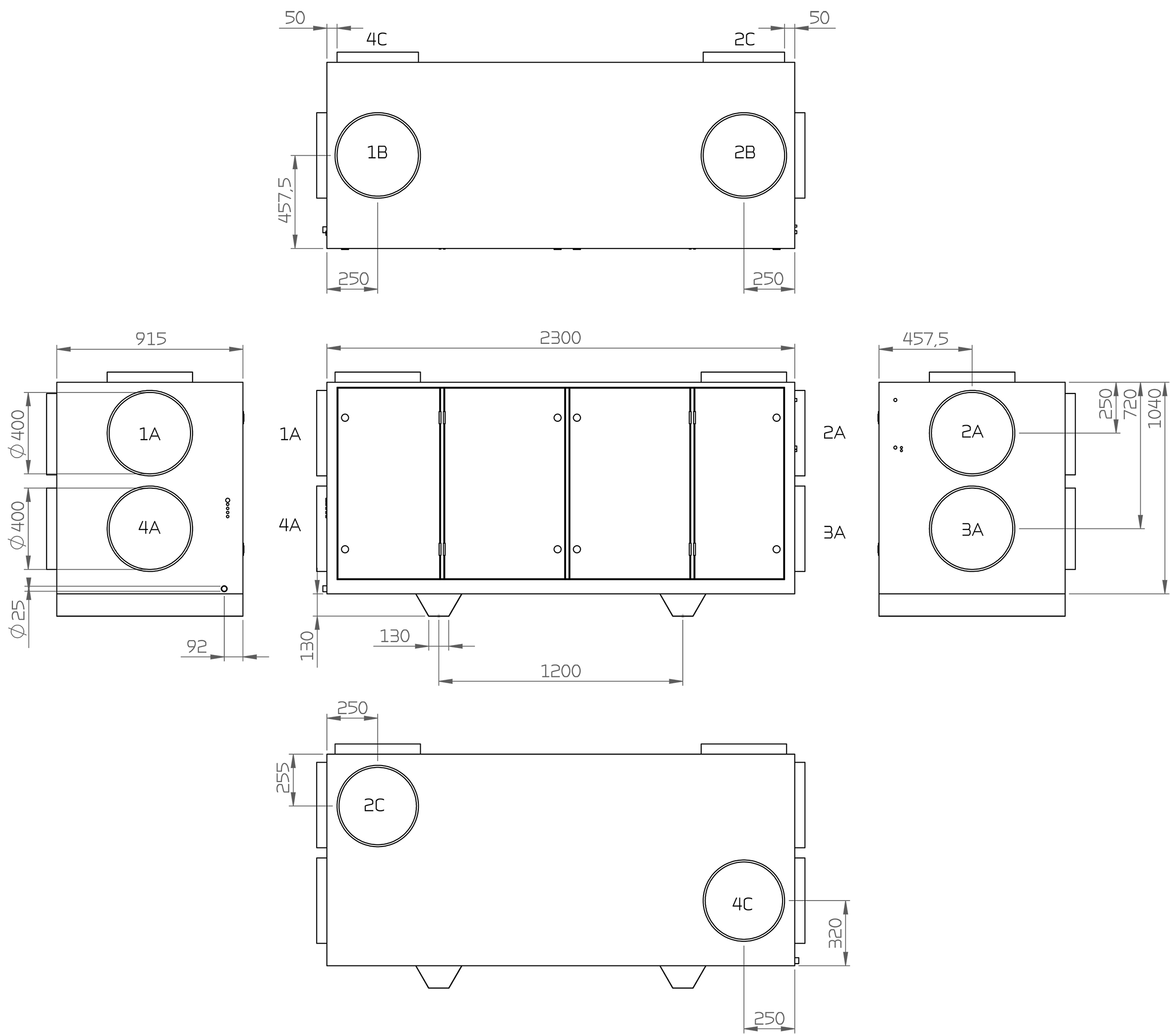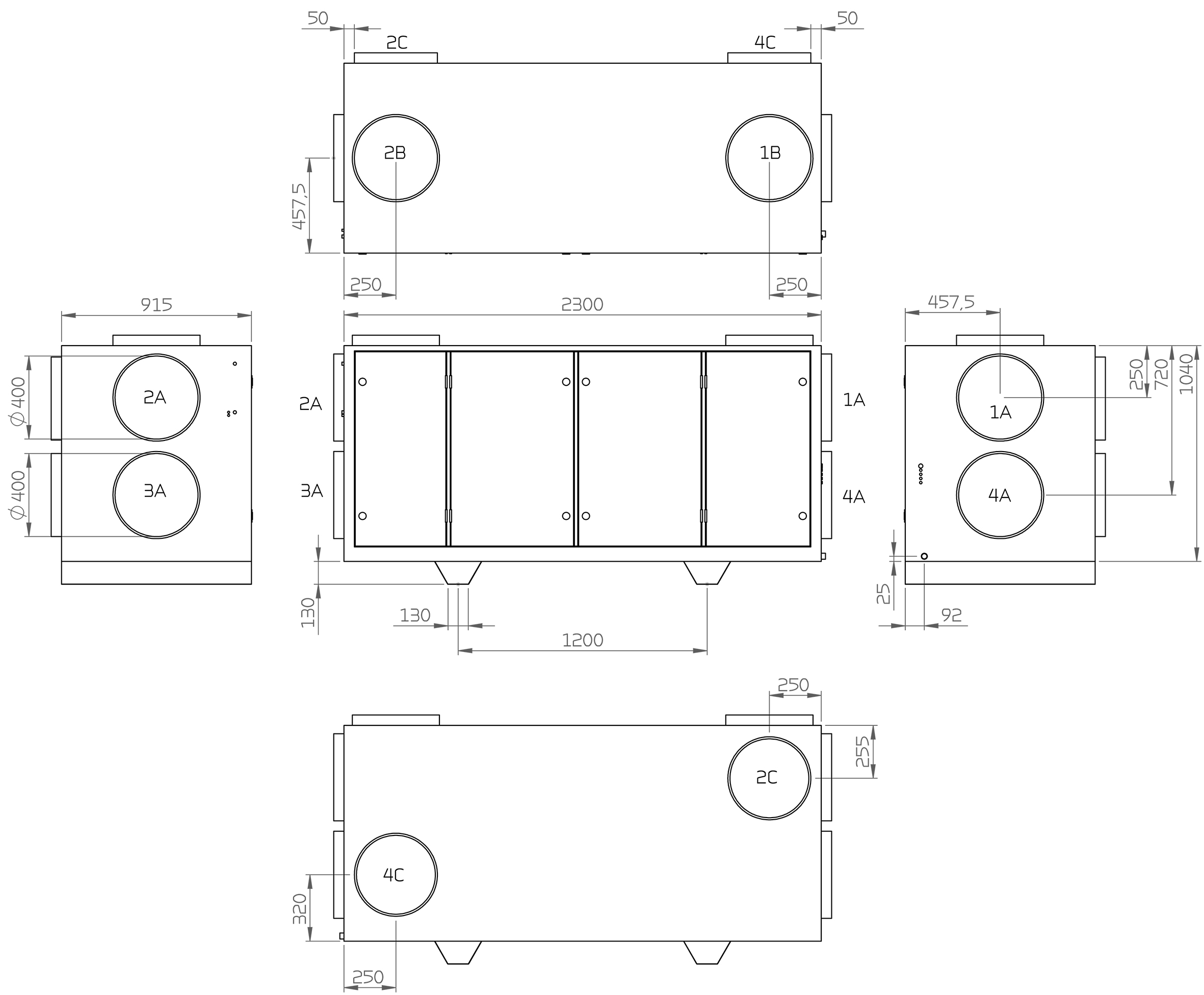All dimensions are in millimetres (mm). Airflow directions: Connection locations: |