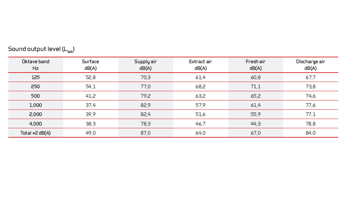 Sound dataSound data for qV = 5600 m3/h and Pt, ext = 250 Pa according to EN 9614-2 for surfaces and EN 5136 for ducts. Sound output level LWA drops with falling air volume and falling back pressure. Sound output level LpA at a given distance will depend on acoustic conditions in the place of installation. |